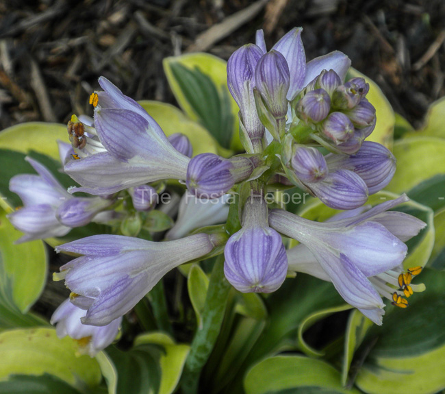 "H. 'Royal Mouse Ears' is described as having blue-green foliage with numerous gold and creamy-white streaks throughout the leaf blade. Jan van den Top reports it emerges with plain bluish-green leaves and streaking appears a month or so later. In addition to streaks in the center, also expect distinct creamy margins. Further, don't be surprised if 'Royal Mouse Ears' settles out as a margined-leaved 'Frosted Mouse Ears'. Recall: 'Frosted Mouse Ears' and 'Holy Mouse Ears' originally came from 'Royal Mouse Ears'."