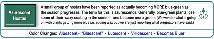 | 'Aristocrat' | Small | Blue/Green | Marginal | Creamy White | TC Sport | Pale-Lavender | July to August | Falstad, C.H. & Walters Gardens | .1997 |