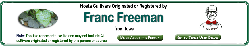 | 'West Point Hanky' | Small | Med-Green | | | Unknown | Unknown | July to August | Freeman, Franc | .2010 |