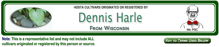 | 'Rainbow's Moon' | Large | Med-Green | Marginal | Light Green | Sport | Pale-Lavender | July to August | Harle, Dennis | --NR-- |