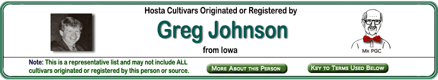 | 'Old Coot' | Small | Dark-Green | | | Hybrid | Pale-Lavender | July | Johnson, Greg | .2004 |