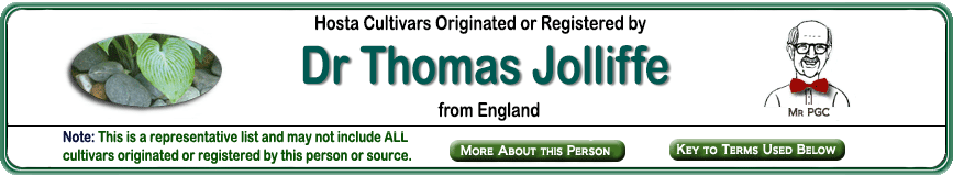 | 'Silver Wedding' | Medium | Blue/Green | | | Hybrid | Pale-Lavender | July | Jolliffe, Thomas | --NR-- |