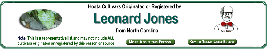 | 'Graceland' (Leonard Jones) | Medium | Dark-Green | Marginal | Green | Hybrid | Pale-Lavender | June to July | Jones, Leonard | .2006 |