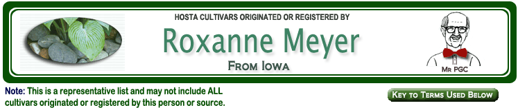 | 'Roxy Moxy' | Small | Med-Green | Marginal | White | Sport | Pale-Lavender | July | Meyer, Roxanne | .2006 |