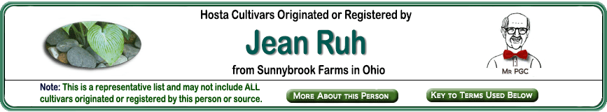 | 'Mount Daisen' | Large | Dark-Green | | | Nat-Sport | Pale-Lavender | June to July | Sugita, Hajime & Ruh, Peter & Ruh, Jean | .2005 |