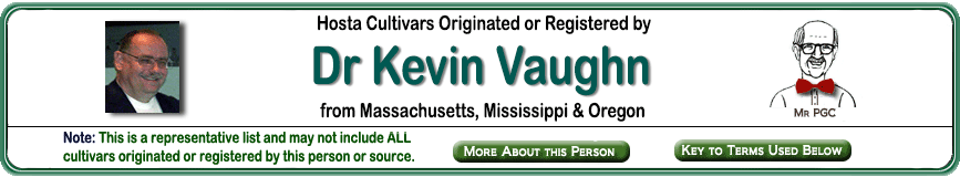 | 'Sunshine Glory' | Large | Med-Green | Marginal | White | Hybrid | Pale-Lavender | July | Vaughn, Kevin | .1982 |