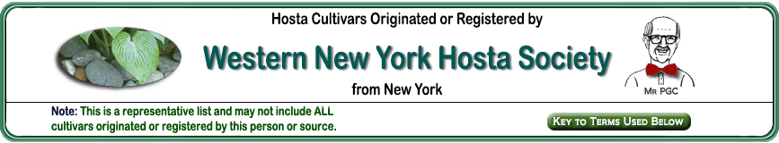 1 'Strip Poker'LargeMed-GreenMarginalYellowSportPale-LavenderJuly to AugustBurlingame, Nancy & Western New York Hosta Society.2004
